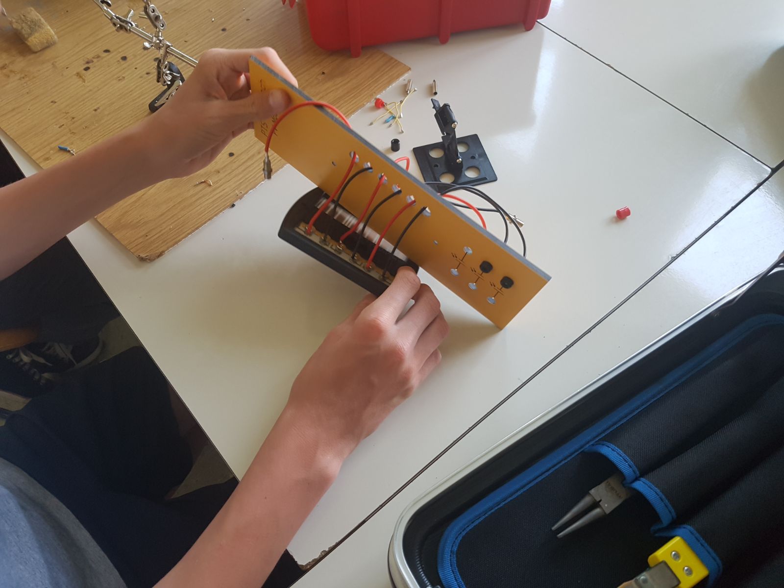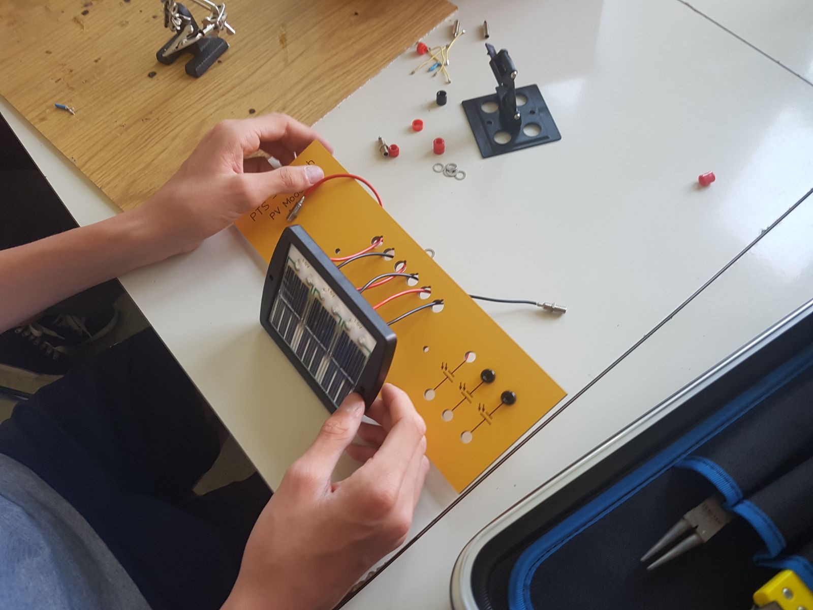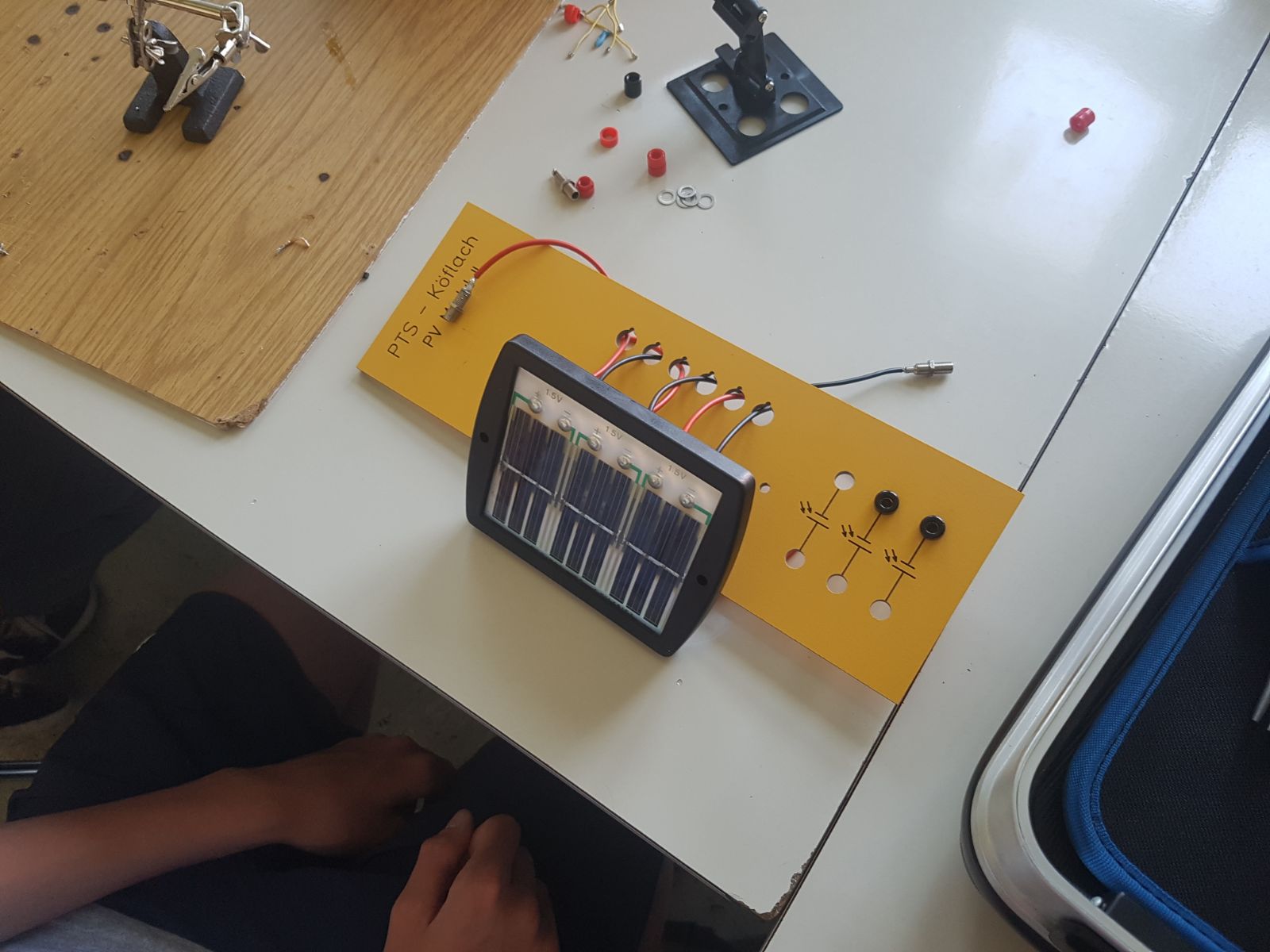 Sie verfassten einen Bericht zum Thema und beantworteten Fragen. Auch im praktischen Teil durften die Schüler eine Installationsplatte für die Werkstatt mit einem Solarmodul bestücken und ausarbeiten.